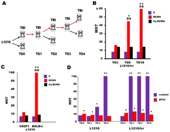 - Bonmassar, E.; Cudkowicz, G.; Vadlamudi, S.; Goldin, A. Influence of tumor-host differences at a single histocompatibility locus (H-1) on the antileukemic effect of 1,3-bis(2-chloroethyl)-1-nitrosourea (NSC 409962). Cancer Res. 1970, 30, 2538–2542. [Google Scholar]