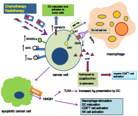 Immunogenic cell death induced by chemotherapy or radiotherapy; possible biochemical patterns. Translocation of calreticulin (CRT) [] from cytoplasm to tumor cell membrane, facilitated by annexin []. Surface CRT is able to induce an “eat me” signal to phagocytes [], increasing their activity along with DC maturation and antigen-presenting function []. The calreticulin effect is antagonized by the interaction of CD47 present on the tumor cell membrane with SIRP-alpha α located on macrophages and DC []), generating a “do not eat me” message in target phagocytes []. Increased expression of HSP90 and HSP70 by ICD inducers []. This is followed by DC maturation and adhesion to tumor cells with consequent enforcement of the host’s cell-mediated immune responses. The augmented expression of MHC and MHC-presented TNA is triggered by ICD inducers [] and, indirectly, by interferons that are induced by the same agents. Moreover, agent-induced upregulation of NKG2DLs on the tumor cell membrane increases antitumor NK cell activity following interaction with NKG2D receptors present on NK cells [,]. Reduced expression of CD47 along with CD46 and CD31 are normally involved in “do not eat me” signaling []. The release of ATP in the tumor environment during ICD activates P2RX7 purinoreceptors present on DC. This is followed by the activation of CD8+T cells. This functional response is inhibited by CD39/ENTPD1 that hydrolyzes ATP [].