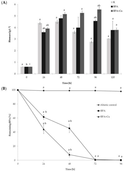 (A) The biomass and (B) kinetics of BPA elimination in M. roridum cultures incubated with the addition of BPA at a concentration of 50 mg·L−1 on Czapek-Dox III medium. Letters represent values with statistically significant differences determined with a one-way ANOVA followed by the Tukey test (α = 0.05) for different treatments.