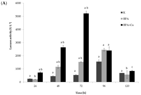 The activity of laccase was assessed in the cultures containing BPA or BPA with copper ions and compared to the control cultures without these compounds. Increased production of the enzyme was observed in the cultures containing BPA, as well as in the cultures grown in the presence of Cu2+ and BPA (Figure 2A). The highest enzyme activity (5100 U·L−1) was determined in the samples after the simultaneous addition of BPA and Cu2+ ions, and it was three times higher than in the systems containing only BPA.