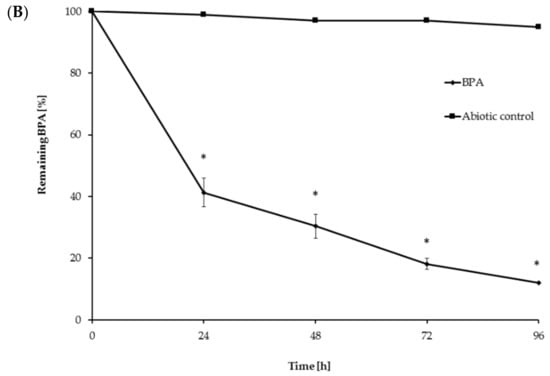The growth and degradability of BPA by the ascomycetous fungus M. roridum IM 6482 was assessed in Czapek-Dox cultures containing 50 mg·L−1 of BPA. The M. roridum strain had been previously described as a producer of copper-induced laccase capable of decolorization of dyes [24,25,26]. Therefore, fungal growth and biodegradation of BPA by M. roridum IM 6482 was also investigated in the presence of copper, which is a commonly known laccase inducer. The addition of BPA or BPA with CuSO4 slightly limited the growth of the fungus on the first day of cultivation (Figure 1A). However, after 48 h, the cultures containing these compounds showed a significant increase in the biomass content compared to the cultures containing neither BPA nor copper ions. The highest intensification of biomass production was observed after 96 h of incubation in the cultures containing BPA and Cu2+. The biomass content in this system was more than half higher than in the control system and was equal to 5.55 g·L−1. It may suggest that BPA, which initially had been toxic to fungal cells, was probably then transformed and used as the source of carbon and energy by M. roridum IM 6482. BPA itself could not serve as the primary energy source for those organisms (data not shown), which indicates that transformation of BPA by M. roridum IM 6482 takes place through co-metabolism. This mechanism of xenobiotic degradation is common in fungi and involves the transformation of a non-growth substrate in the obligate presence of a growth substrate or another transformable compound [27,28].
