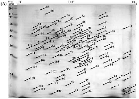 The protein solution was diluted using SB buffer to obtain 1000 μg·mL−1 for immobilized pH gradient (IPG) strip. Isoelectric focusing was performed on immobilized non-linear pH 3–11 gradient 17 cm IPG strips. IPG strips with focused proteins were reduced using DTT and followed by alkylation with iodoacetamide (IAA). The second dimension SDS-PAGE was run on a running gel with a stacking gel on top. Electrophoretic separation was carried out using 35 mA for approximately 12 h. The gels were calibrated with a molecular mass marker of 6500–200,000 Da (Sigma-Aldrich, St. Louis, MO, USA) and stained with Coomassie blue.