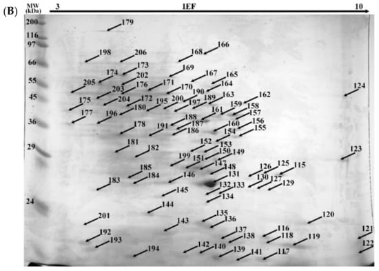 Representative 2-DE gels of intracellular proteome of M. roridum IM 6482 obtained from (A) control cultures (without BPA) and (B) after exposure to 50 mg·L−1 BPA.