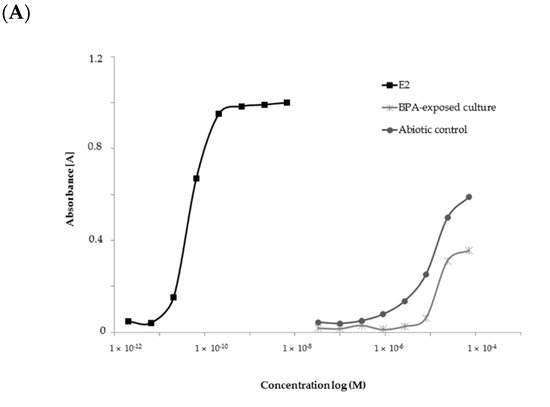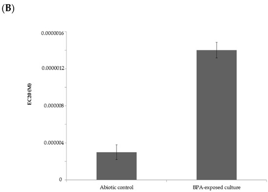 (A) ER dose-response curves and (B) EC20 (M) values for extracts of abiotic control and M. roridum IM 6482 culture cultivated in Czapek-Dox III medium containing the addition of BPA (50 mg·L−1).