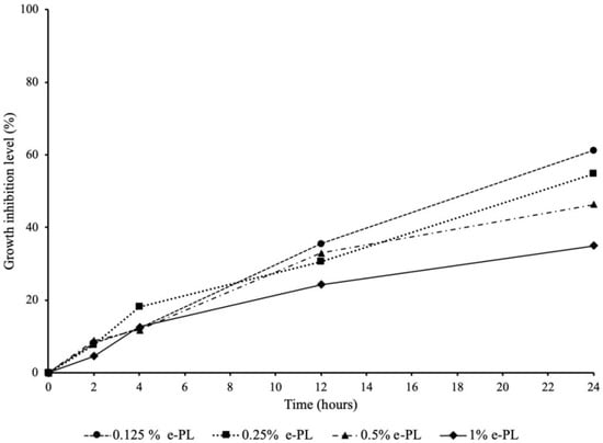 Figure 2 shows the inhibitory effect of ε-polylysine on the P. gingivalis growth. All four concentrations of ε-polylysine achieved 24.31% to 35.56% growth inhibition level against P. gingivalis after 12 h of incubation. The growth inhibition levels steadily increased up to 24 h. At 24 h of incubation, the highest growth inhibition was observed in 0.125% ε-polylysine with 61.19%. The other three groups of ε-polylysine achieved 34.97% to 54.66% growth inhibition levels against P. gingivalis after 24 h incubation.