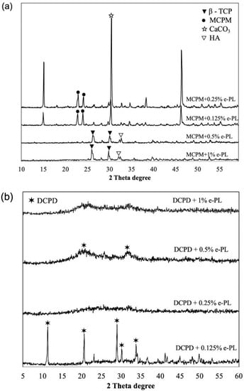 The crystal phase and size of calcium phosphate and ε-polylysine mixtures were analyzed using the XRD patterns. Figure 3 shows the XRD patterns for the DCPD and MCPM mixed with different concentrations of ε-polylysine, respectively.