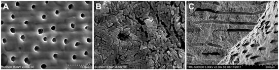 SEM images of the control dentin disc surface, (A) dentin disc surface with open dentin tubules; (B) dentin surface with 7-day P. gingivalis biofilm; (C) longitudinal dentin tubules of control dentin disc.