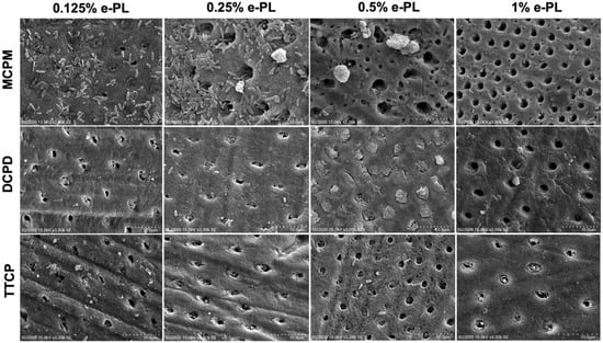 Complete bacterial inhibition and the highest dentin tubule occlusion rate was observed in DCPD + 0.5% ε-PL group with 98.19 ± 3.31% occlusion rate compared to other DCPD groups on P. g-infected dentin specimens (Figure 6a). DCPD + 0.125% and DCPD + 0.25% ε-PL groups showed bacterial inhibition and occlusion degree of 72.52 ± 22.18% and 78.69 ± 12.8%, respectively. In MCPM + ε-PL treatment groups, the bacterial inhibition was minimal and a great quantity of live adherent bacterial cells on dentin surface was observed (Figure 5). Following MCPM and ε-polylysine application, the calcium phosphate precipitates with visible dead bacterial cells were formed on dentin surface as early as after the application. The precipitates were larger than the tubule orifice and formed non-homogenously on the dentin surfaces. The highest tubule occlusion degree was observed in the MCPM + 0.125% e-PL group (8.33 ± 23.41%). The MCPM + 0.25% ε-PL and MCPM + 1% ε-PL groups showed the tubule occlusion degree of 7.48 ± 24.43% and 7.4 ± 23.04%, respectively. The tubule occlusion degree in MCPM + 0.5% ε-PL group was 6.69 ± 23.22%. The differences in the mean tubule occlusion degree between MCPM groups were not statistically significant (Figure 6b). In TTCP + ε-PL groups, complete bacterial inhibition and partial dentin tubule occlusion with calcium phosphate precipitates was observed (Figure 5). The highest tubule occlusion degree in TTCP + ε-PL groups was observed in TTCP + 0.25% ε-PL group (72.07 ± 12.81%) after 6 h of incubation following the application. The tubule occlusion degree in TTCP + 0.125% ε-PL and TTCP + 0.5% ε-PL groups were 62.87 ± 25.12% and 66.9 ± 27.72%, respectively. The TTCP + 1% ε-PL group showed the occlusion degree of 54.57 ± 18.28%. The differences in the mean tubule occlusion degree between four TTCP groups were not statistically significant (Figure 6c). There was no statistically significant difference between DCPD and TTCP groups in the same concentration of ε-polylysine.