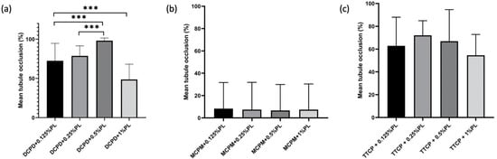 Dentin tubule occlusion rate in three groups after CPP and ε-PL application. (n = 10). (a) occlusion rate of DCPD groups on P. g-infected dentin specimens (b) occlusion rate of MCPM groups on P. g-infected dentin specimens (c) occlusion rate of TTCP groups on P. g-infected dentin specimens. *** p < 0.001.