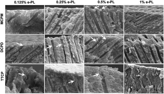 SEM images of longitudinal fractured dentin discs after 72 h of incubation in artificial saliva following CPP and ε-PL application. Arrows depict the crystallizations formed inside the dentin tubules.
