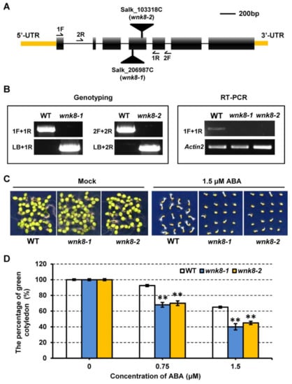 A previous study showed that different T-DNA insertion mutants of WNK8 led to opposite ABA responses during seed germination []. To learn more about the roles of WNK8 in response to ABA, two T-DNA insertion mutants, SALK_206987C (wnk8-1) and SALK_103318C (wnk8-2), were used in this study (Figure 1A). The T-DNA insertions were confirmed to be present in the fourth exon of the WNK8 gene by genotyping and sequencing (Figure 1B). An RT-PCR analysis using region-specific primers detected no WNK8 transcript in either allele (Figure 1B).