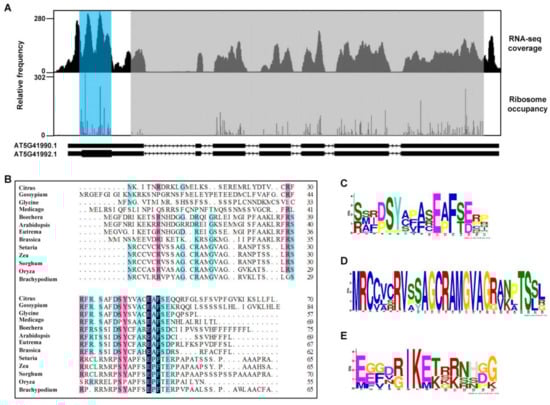 Conserved open reading frame is found in the 5′-UTR of WNK8. (A) Comparative ribosome footprinting profile of WNK8. The coverage of RNA-seq reads is shown in upper panel and the ribosome occupancy is shown in lower panel. Light blue: CPuORF58; Gray: main ORF; White: UTR. (B) Sequence alignment of the predicted amino acid sequences of CPuORF58 from different plant species. The sequence logos are resulted from the sequence alignment of the uORFs from all selected plant species (C), monocts (D), and dicots (E). Letter height indicates the frequency in the alignment.