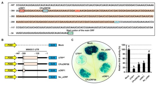 Plants have developed diverse environmental adaptation strategies for their development and survival. In general, they adapt to alterations in environmental conditions by controlling their gene expression profiles through both transcriptional regulation and post-transcriptional regulation. It is widely known that different regulatory elements are present in the 5′-UTR of mRNAs. uORFs appear in the 5′-UTR as translational control elements, which generally attenuate the translation of the downstream mORF in most cases [,,,]. uORFs have been found in approximately 20% to 50% of eukaryotic transcripts. Approximately 50% of protein-encoding genes possess one or more uORFs in humans []. In plants, 24–30% of the 5′-UTR of mRNAs contains uORFs; however, only a few uORFs have been identified and characterized [,]. Therefore, it is necessary to further explore uORFs in plants and investigate their translational control mechanisms, which could provide a deeper understanding of plant development and adaptations to changing environments.