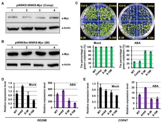These lines were further selected to evaluate the role of WNK8 in the ABA response. As expected, the complementation of WNK8 in wnk8-1 (Comp) showed a phenotype similar to that of the wild-type phenotype. However, plants transformed with pWNK8m:WNK8 exhibited much lower sensitivity to ABA (Figure 5C). We further investigated the expression patterns of the ABA response genes RD29B and COR47 in these genetic backgrounds. Under normal conditions, the expression levels of the two ABA response genes were similar in all selected plants, but slightly lower in plants transformed with pWNK8m:WNK8 (Figure 5D,E). After ABA treatment, the transcription levels of both RD29B and COR47 were significantly increased, with the highest in the wnk8 mutant. The expression of the two ABA response genes was also induced in plants transformed with pWNK8m:WNK8 but was lower than their expression in Col-0 and wnk8 mutant plants. This suggested that WNK8 negatively affected the expression of ABA response genes, which is consistent with a previous study [].