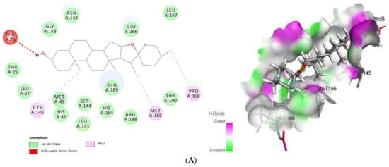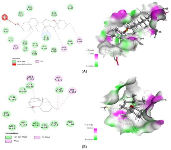 2D (left) and 3D (right) of tomatidine (A) and patchouli alcohol (B) with the active site of 6LU7. (A): Tomatidine-3CL-protease (PDB ID: 6LU7; (Gold Fitness Score 41.42). Type of the binding: van der Waals: Thr25, Leu27, Met49, His41, Ser144, Leu141, His164, Gln189, Arg188, Thr190, Glu166, Gly143, Asn142, Leu167; Unfavorable donor-donor: Thr26; Alkyl: Cys145, Met165, Pro168. (B): Patchouli alcohol-3CL-protease (PDB ID: 6LU7); (Gold Fitness Score 30.65). Type of the binding: van der Waals: His41, Met49, Gly143, Asn142, Leu141, Ser144, Phe140, Cys145, His164, Glu166, Gln189; Alkyl: Met165, His172, His163.