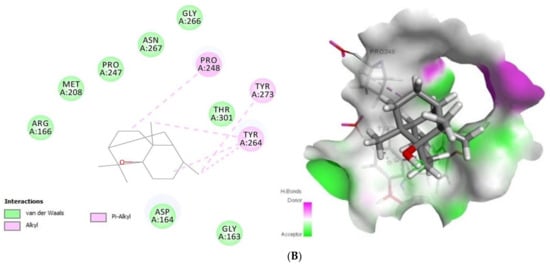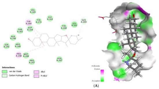 COX-2 (PDB ID: 5F1A) is one of cyclooxygenase (COX) that able to catalysis the reaction forming prostaglandins and leukotrienes, respectively, from arachidonic acid, which is pathological conditions such as inflammation, pain and fever and respiratory diseases. Tomatidine bound to COX-2 with a Gold Fitness Score of 43.64 (Figure 4) establishing the van der Waals interactions with Phe198, Thr206, Phe210, Thr212, Asn382, Tyr385, Trp387, Leu390, Leu391, Gln203, Val447 and Gln454, Pi-Sigma interactions with His214 and Pi-Alkyl interactions with His388, His386, His207, Ala199, Ala202 and His214 In contrast, patchouli alcohol binds to the same target (−27.73 kcal/mol) with the residues Tyr148, Phe210, Lys211, Thr212, Asn382, Ser451, Gln454 (van der Waals) and His207, His214, His386, His388, Val447 (Alkyl/Pi-Alkyl).