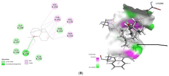 2D (left) and 3D (right) of tomatidine (A) and patchouli alcohol (B) with the active site of 6VWW. (A): Tomatidine-NSP15 (PDB ID: 6VWW) (Gold Fitness Score 43.62); Type of binding: van der Waals: Pro344, Lys345, Leu346, Ser294, Val292, Cys293, Gly247, Lys290, Gly248, Thr341, Lys345, Trp333, Glu340; C-H bond: His235; Pi-Sigma: Tyr343; Pi-Alkyl: His250, Tyr343, His235. (B): Patchouli alcohol-NSP15 (PDB ID: 6VWW) (Gold Fitness Score 27.47); Type of binding: van der Waals: Gly248, Glu247, Leu246, Gln245, Thr341; H-bond: Lys290; Alkyl/Pi-Alkyl: His250, Tyr343, His235, Trp333.