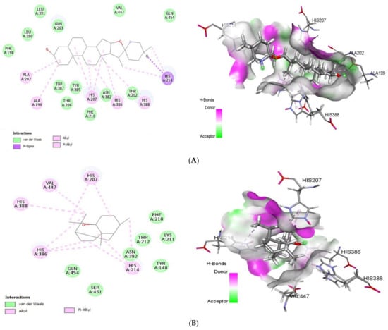 2D (left) and 3D (right) of tomatidine (A) and patchouli alcohol (B) with the active site of 5F1A. (A): Tomatidine-COX-2 (PDB ID: 5F1A) (Gold Fitness Score 43.64); Type of binding: van der Waals: Leu390, Leu391, Gln203, Val447, Gln454, Thr212, Asn382, Phe210, Tyr385, Thr206, Trp387, Phe198;Pi-Sigma: His214; Pi-Alkyl: His388, His386, His207, Ala199, Ala202, His214. (B): Patchouli alcohol-COX-2 (PDB ID: 5F1A) (Gold Fitness Score 27.73); Type of binding: van der Waals: Phe210, Lys2111, Thr212, Asn382, Tyr148, Ser451, Gln454; Alkyl/Pi-Alkyl: His214, His386, His388, Val447, His207.