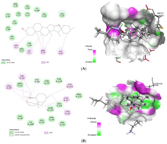 2D (left) and 3D (right) of tomatidine (A) and patchouli alcohol (B) with the active site of 4UY1. (A): Tomatidine-sPLA2 (PDB ID: 4UY1) (Gold Fitness Score 42.59); Type of binding: van der Waals: Val9, Leu98, Ile94, Cys43, Asp47, Phe26, His46, Cys27, Gly28, Leu29, Tyr20, Pro17; Alkyl: Leu5, Ile2, Met21, Lys61. (B): Patchouli alcohol-sPLA2 (PDB ID: 4UY1) (Gold Fitness Score 38.28) Type of binding: van der Waals: Met21, Tyr23, Tyr110, Pro111, Gly24, Gln112, Phe26, His32, Gly31, CA200, Gly30; C-H bond: Gly28; Alkyl: Leu29, Lys22, Cys115, Cys27, Cys25.