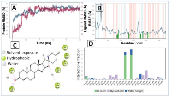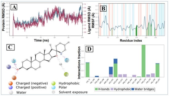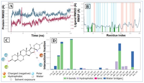 MD simulation analysis of tomatidine—SARS CoV-2 NSP15 complex: (A) RMSD (protein RMSD is shown in grey while RMSD of tomatidine are shown in red), (B) protein RMSF, (C) 2D interaction diagram and (D) protein–ligand contact analysis of MD trajectory.