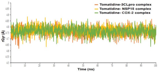 Radius of gyration (rGyr) graph of tomatidine in complex with SARS CoV-2 3CLpro, NSP15 and human COX-2 protein at 100 ns.