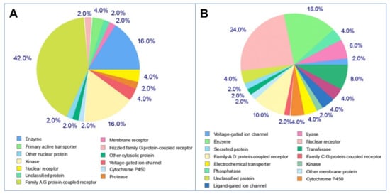 Pie-chart of top-50 of target predicted for selected molecules (A: tomatidine, B: patchouli alcohol).