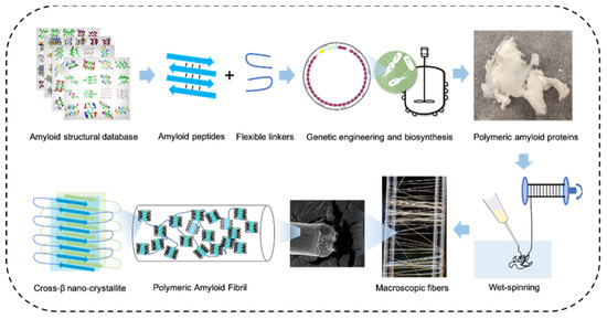 Fabrication procedures of mechanically strong macroscopic polymeric amyloid fibers. Amyloid peptides were incorporated into tandem repeats of spidroins to replace the original polyalanine segments. Upon spinning, these amyloid peptides promoted the formation of β-nanocrystals, consequently making the macroscopic fiber stronger. Reprinted with permission [34]. Copyright 2021, American Chemical Society.