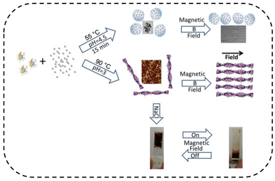 Magnetic-responsive β-lactoglobulin-Fe3O4 hybrid hydrogel. When a magnetic field was applied, amyloid fibrils became aligned. As a result, the amount of intermolecular contact reduced, and the hydrogel collapsed. When the magnetic field was turned off, hydrogel formed again. Reprinted with permission [117]. Copyright 2013, American Chemical Society.