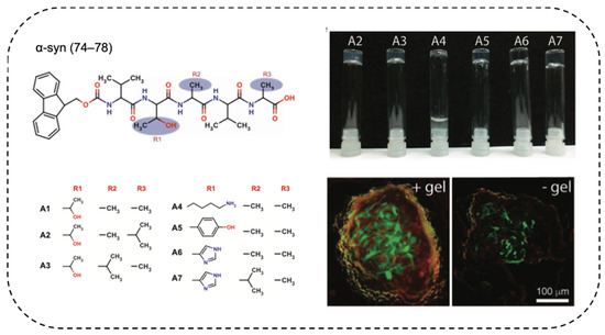 α-synuclein-inspired hydrogel that supported neuron differentiation. The β-sheet-zipper-forming sequence of α-synuclein VTAVA was mutated to facilitate the self-assembly of the peptides, which provided mechanical support, and enabled the proper differentiation of stem cells into neurons. Reprinted with permission [132]. Copyright 2016, Nature Publishing Group.