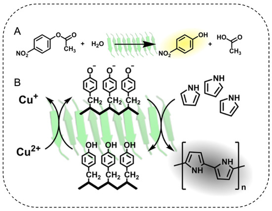 Histidine often plays an important roles in esterase, serving as both proton donor or acceptor during ester hydrolysis [141]. Spatially organizing multiple histidine side chains into close proximity by controlled amyloid assembly can promote esterase activity. Diaz-Caballero et al. designed such a peptide using only histidine and tyrosine (HYHYHYHY), which self-assembled into cross-β fibrils (Figure 6) [142]. Tyrosine residues promoted the self-assembly of the peptide into nanofibrils while also displaying oxidase activity. Histidine was chosen for its propensity to form non-covalent interactions between fibrils and for its hydrolase activities [87,143,144]. Hydrogelation occurred at pH 8.0, and reversibly turned to fluid at pH 4.0. The pH-responsiveness, together with the high esterase-oxidase dual enzyme activity, has opened up new applications for amyloid fibrils as catalytic materials [142].