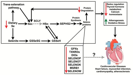Potential mechanism of how Se deficiency impacts Se metabolism and contributes to cardiovascular diseases. Se acquired through the diet can go through the trans-selenation pathway and be directly converted to Sec, becoming hydrogen selenide. In cases of low Se, stress-responsive selenoprotein synthesis may be affected. Those selenoproteins with known function in the heart are shown above but it is still unknown how some of these proteins contribute to the development of cardiovascular disease in cases of Se deficiency. Decreased levels of Se may negatively impact redox regulation, thyroid hormone metabolism, and calcium flux while increasing atherogenesis and oxidative stress. This, in turn, may lead to several cardiovascular diseases, including heart failure, myocardial infarction, cardiomyopathy, and atherosclerosis. Red arrows indicate processes and proteins that are decreased while green arrows indicate processes that are increased during Se deficiency. Black arrows point to known relationships, and dashed gray lines indicate the relationships that have not been established yet in the heart. The “?” indicates mechanisms that have not been determined. Se, selenium; Sec, selenocysteine; HSe–, hydrogen selenide; SEPHS2, selenophosphate synthetase 2; GPX, glutathione peroxidase; TXNRDs, thioredoxin reductases; DIO, iodothyronine deiodinases; SELENOP, selenoprotein P; SELENOT, selenoprotein T; SELENOK, selenoprotein K; MSRB1, methionine sulfoxide reductase B1; SELENOW, selenoprotein W. Heart was used from Servier Medical Art (smart.servier.com).