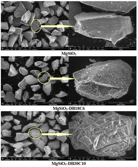 The SEM image of MgSiO3 shows an initially porous and homogeneous surface [,], that changes after the functionalization by impregnation with the crown ether, as can be observed in the high magnification images.