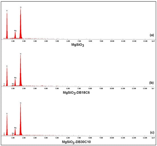 The EDX spectra (Figure 2) confirm the functionalization of the MgSiO3 support with the two crowns. Figure 2a illustrates the specific peaks of the adsorbent (Mg, Si and O) in the range 2–4 keV. The peak C (also visible in Figure 2a) comes from carbon in self-adhesive carbon paper, and in the case of EDX spectra in Figure 2b,c, additionally from crown ethers.
