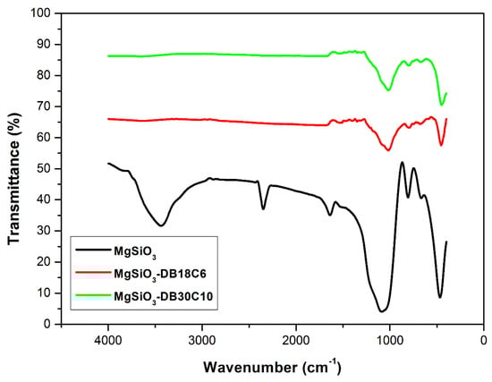 FT-IR spectra of MgSiO3, MgSiO3-DB18C6 and MgSiO3-DB30C10.