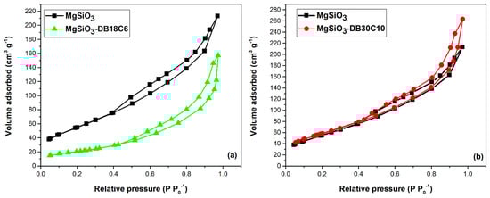 A comparison between the N2 adsorption–desorption isotherms of MgSiO3 and MgSiO3-DB18C6 and MgSiO3 and MgSiO3-DB16C6, respectively, is presented in Figure 4.