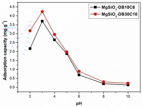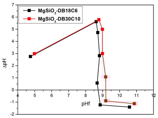 The pHPZC of the MgSiO3-DB18C6 was found to be 8.7 and pH PZC of MgSiO3-DB30C10 was found to be 9.2. For this pH value, both cationic and anionic species can be adsorbed on the surface of the functionalized material. For pH values below the pHPZC value, the surface of the material will be positively charged due to the adsorbed protons, favoring the adsorption of anionic species. For pH values above the pHPZC value, the surface of the material will be negatively charged due to the adsorbed hydroxyl ions, favoring the adsorption of cationic species.