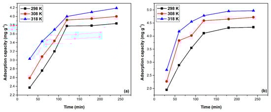 Figure 7 illustrates the effect of contact time and temperature on the adsorption process. As the contact time between adsorbent and adsorbed increases, the adsorption capacity for both materials increase up to a certain point. Thus, after 120 min, the adsorption capacity remains approximately constant, namely for MgSiO3-DB18C6 in the range of 3.8–4.0 (mg g−1) and for MgSiO3-DB30C10 in the range of 4.0–4.8 (mg g−1), depending on the temperature. The adsorption process is positively influenced by the temperature. As the temperature increases, in the range of 298–318 K, the adsorption capacity increases, but not significantly, so that studies can be performed at a temperature of 298 K.