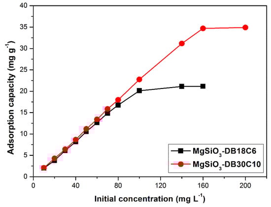 Experimental data show that for the MgSiO3-DB18C6 adsorbent, an initial concentration of ~100 (mg L−1) leads to a maximum adsorption capacity of ~20 (mg g−1) and respectively, for the MgSiO3-DB30C10 material, an initial concentration of 160 (mg L−1), leads to a maximum adsorption capacity of 34.7 (mg g−1). The difference between the two adsorbents’ behavior is generated by the significant size difference between them: the crown ether DB30C10 is larger (almost double the number of O atoms) than DB18C6.