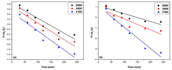 Pseudo-first-order kinetic models: (a) MgSiO3-DB18C6, (b) MgSiO3-DB30C10.