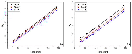 The results obtained using the pseudo-second-order kinetic model for modelling the experimental data, obtained based on the function t/qt = f(t), using materials studied at the three temperatures, are represented in Figure 10. The calculated kinetic parameters associated with the pseudo-second-order kinetic model are presented in Table 2.