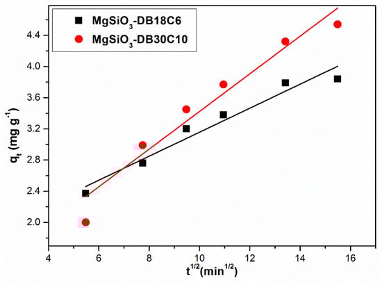 The possibility of intraparticle diffusion is further investigated. The particle agitation effect on intraparticle diffusion is insignificant since it increases the agitation degree, reducing the thickness of the boundary layer and thus only increases the external mass transfer coefficient. Figure 11 shows the intraparticle diffusion model specific to the Pd(II) adsorption process on MgSiO3-DB18C6 and MgSiO3-DB30C10 materials in the linearized form.