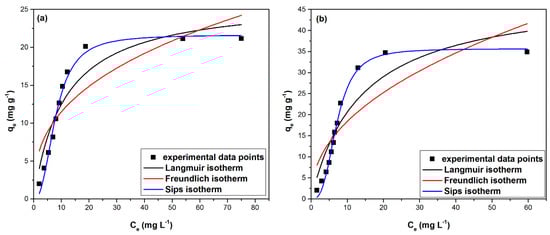 Langmuir, Freundlich and Sips isotherms: (a) MgSiO3-DB18C6, (b) MgSiO3-DB30C10.