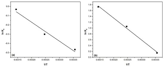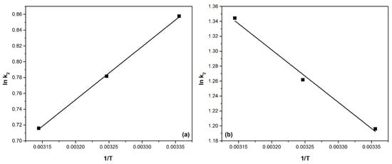 The activation energy for adsorption processes is calculated based on the function ln (k2) = f(1/T) as presented in Figure 13 using the calculated values of the velocity constant (k2) obtained based on the pseudo-second-order kinetic model in Arrhenius’ equation.