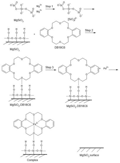 Magnesium silicate is known to be used as a support functionalized with various active groups such as −NH2, −SH, −PO3H2, etc., in order to obtain high-performance materials for the metal ions’ recovery/removal from aqueous solutions [,].