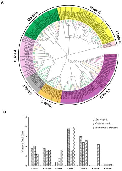 The molecular evolution of the PG family is decided mainly by the evolution of increasingly sophisticated organs in plants [,]. To investigate the phylogenetic relationship of the PG gene family in maize, an unrooted phylogenetic tree was constructed from the alignment of full-length PG proteins of maize, Arabidopsis thaliana, and rice (Figure 1A, File S1). The results showed that 165 PGs are grouped into seven Clades and correspondingly named Clades A to G based on a previous study []. Clade A and Clade B each contain 9 ZmPGs, and Clade C to Clade E contain 2, 19, and 15 ZmPGs, respectively (Figure 1B, Table S2). The gene numbers of the three species in Clade B and Clade G are roughly the same, and PG genes of the three species are evenly distributed in each branch. The numbers of maize and Arabidopsis PG genes in Clade D are approximately twice those of rice, suggesting that the duplication of these Clade PG genes in maize and Arabidopsis occurred after specification. Interestingly, Arabidopsis has eleven members in Clade F, while maize and rice are absent from this Clade, indicating that these genes probably emerged after monocot and dicot plant separation. In contrast, Arabidopsis has fewer PG members in Clade A than maize and rice do. It is speculated that these monocot-specific or dicot-proliferated PG genes are probably functionalized for monocots and dicots development during evolution (Figure 1B).