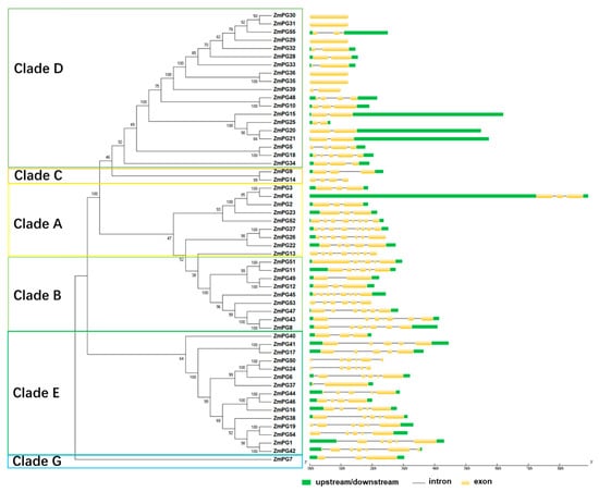 An unrooted phylogenetic tree was reconstructed using full-length protein sequences of the 55 ZmPGs with the neighbor-joining (NJ) method. The tree was divided into six main Clades (Clades A to G; Clade F was not included herein and hereafter, as maize does not have a Clade F member) (Figure 2). To explore the relationship of gene structure and phylogeny, we investigated gene structures by GSDS []. The results showed that there are a different number of exons in ZmPG genes (Figure 2), ranging from 1 to 9. ZmPGs in Clades C and D containing exo-PGs have shorter gene sequences and fewer exons, while the ZmPGs in Clade E containing oligo-PGs generally have longer intron sequences. Consistent with the phylogenetic relationship, closely related genes usually have common gene structures and intron lengths. However, some ZmPGs in Clade B show a significant difference in gene structural arrangements. For instance, ZmPG49 contains only two exons, while ZmPG45 contains 8 exons (Figure 2).