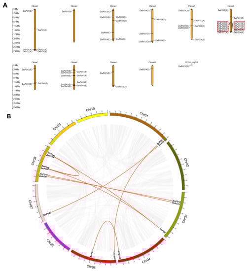 Chromosomal location and synteny analysis of ZmPGs in maize genome. (A) Chromosomal locations of ZmPGs. Tandem-duplicated genes are indicated with red boxes, the chromosome number is indicated above each chromosome. The scale is in megabases (Mb). (B) Syntenic relationship of ZmPGs. The annotations on the fragments represent different chromosomes, and the numbers in the outermost circle represent the positions on the corresponding chromosomes. The ZmPGs involved in segmental duplications in the ZmPG gene family are mapped to their respective locations of the maize genome in the circular diagram. The red lines represent the segmental duplication pairs between the ZmPGs and the gray lines represent the segmental duplication pairs in the whole maize genome.