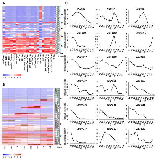 To investigate the expression patterns of ZmPGs, RNA-seq data of 20 maize tissues were retrieved from the SRA (Sequence Read Archive) database, and RNA-seq analysis was further performed to obtain FPKM values of ZmPGs (Table S3). The results showed that 48 ZmPG genes were expressed in at least one tissue and the expression levels of the 48 genes were represented by a heatmap, as shown in Figure 4. However, there are 7 genes (ZmPG14, ZmPG24, ZmPG25, ZmPG32, ZmPG39, ZmPG50, and ZmPG53) that had no detectable expression or low expression (FPKM less than 1 in both tissues) were filtered out. As shown in Figure 4A, ZmPG genes in Clade E were constitutively expressed in various tissues, while ZmPG genes in Clade D were specifically expressed in anther, and ZmPG34 was specifically expressed in the meiotic tassel. Clade C has only two members, ZmPG9 was constitutively expressed at high levels, but the expression of the other member ZmPG14 could not be detected in any of the analyzed tissues, indicating their variations in cis-regulation. The orphan gene ZmPG7 of Clade G was highly expressed in most analyzed tissues, including the meiotic tassel.