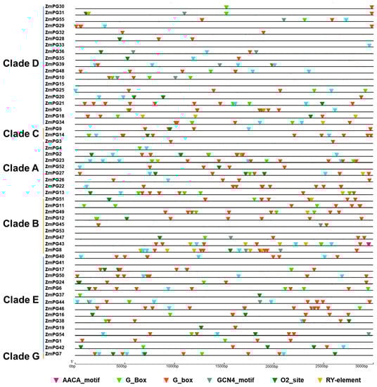 Schematic model of seven cis-elements in the promoter sequences of ZmPGs. AACA_motif is associated with endosperm-specific negative expression, the G-box/G-Box cis-acting regulatory element is involved in light responsiveness, GCN4_motif is involved in endosperm expression, MBS represents a MYB binding site, O2-site represents a cis-acting regulatory element, which is involved in zein metabolism and regulation, and RY-element is involved in seed-specific regulation.