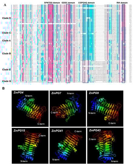 Conserved domain and structural analysis of ZmPGs. (A) Amino acid sequences alignment of four conserved domains in ZmPGs. The conserved sequences of the four conserved domains are shown at the top. The annotations on the left indicate the different classifications of PGs. (B) Three-dimensional structures of six representative ZmPG proteins.